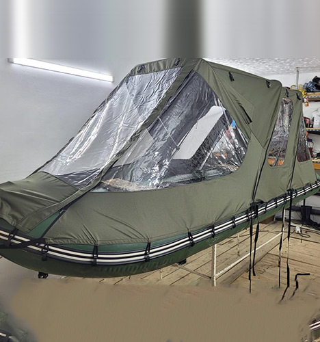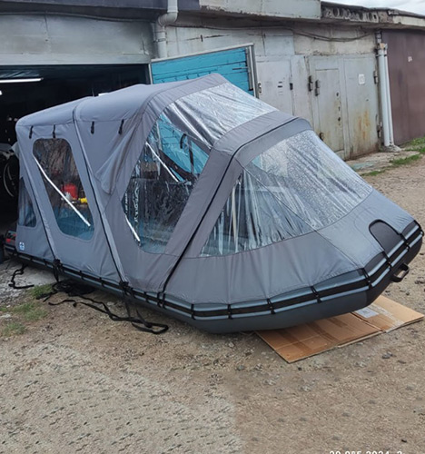 Тент с задней дверью для выхода к мотору, небольшими боковыми окнами и усиленными краями для установки застёжек. Изготовлен из специализированной тентовой ткани Оксфорд 600 повышенной плотности